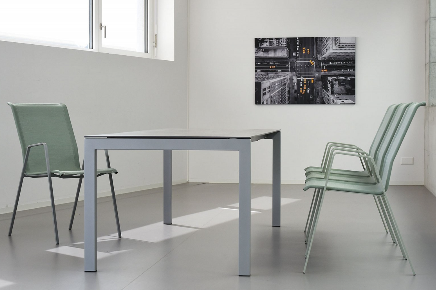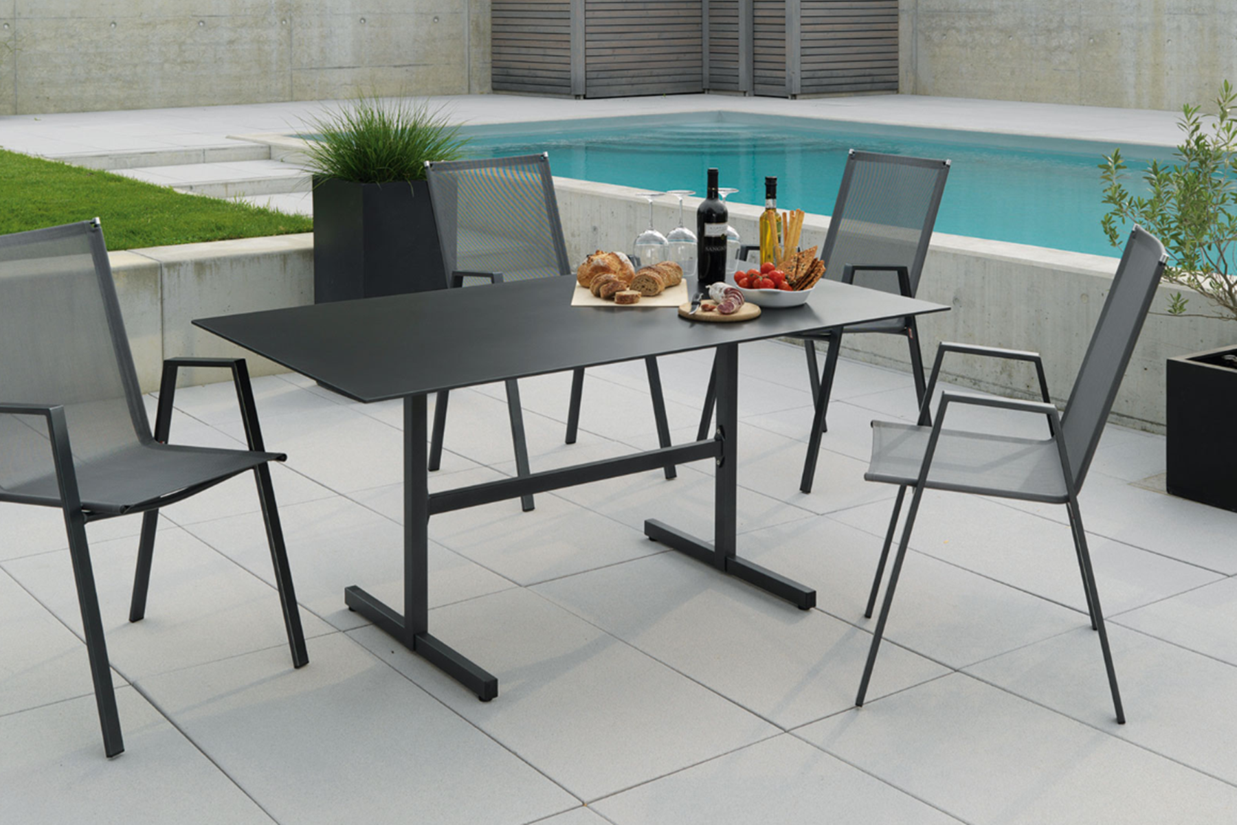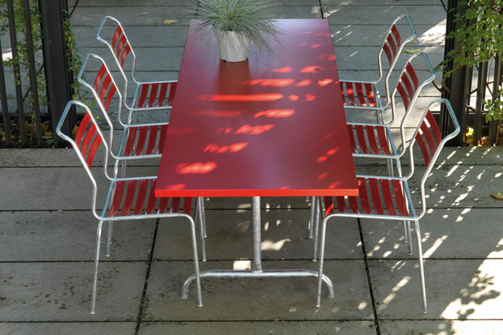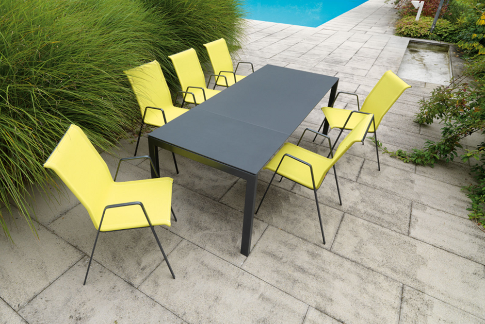 Die nur acht Millimeter dünne Schaffner-Fiberglasplatte verleiht dem Tisch eine zeitlose und elegante Leichtigkeit. Der Tisch ist selbstverständlich wetterfest und abklappbar. Dazu der passende Stuhl mit der angenehmen «Batyline®»-Bespannung; Sie haben die Wahl. Die Stühle sind Schaffner-typisch wetterbeständig und stapelbar.| Swiss Made