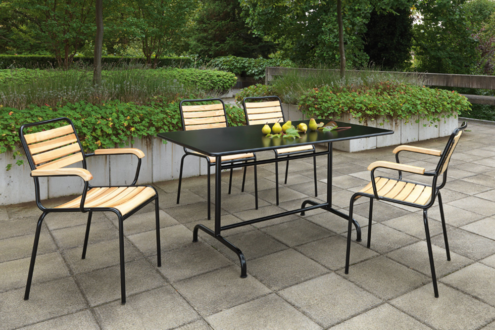 Der Klassiker: Die Linie «Säntis» erfreut immer wieder durch die Leichtigkeit ihres Designs, kombiniert mit Solidität und robuster Wetterfestigkeit. Die Tischplatte ist abklapp- und arretierbar. Die Stühle sind ebenfalls wetterbeständig und stapelbar. Erhältlich mit oder ohne Armlehnen, mit Latten oder auch mit «Spaghetti»-Bespannung.